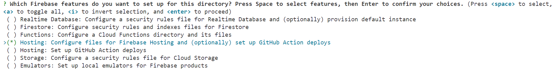 파이어 베이스에서 시작할 기능을 스페이스로 선택하세요.